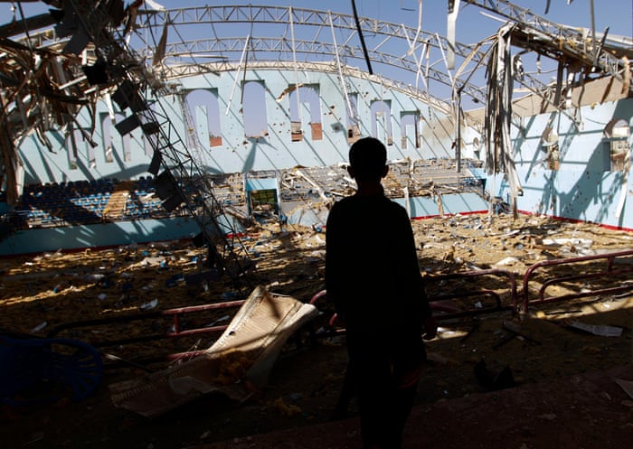 A Yemeni boy inspect the damage at a sports hall in Sana’a Photograph: Mohammed Huwais/AFP/Getty Images