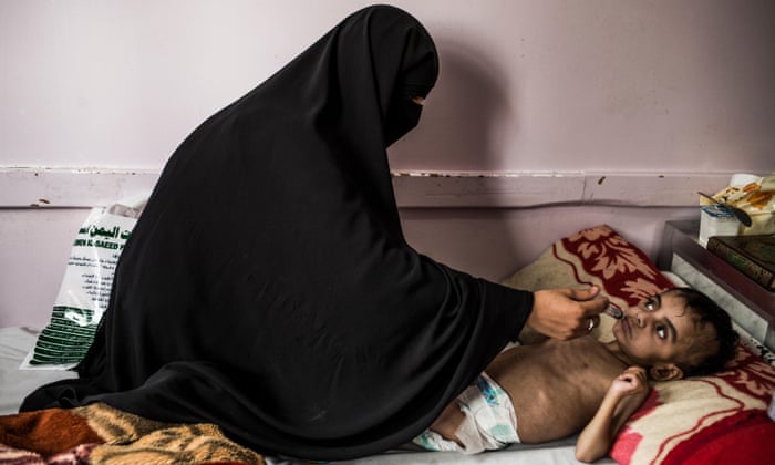 In one room a mother in black crouched on a bed, feeding a five-year-old child with severe malnutrition. He stared at her with large sunken eyes, patches of black hair stuck on his skull, his two pencil-thin arms folded back at the elbow.