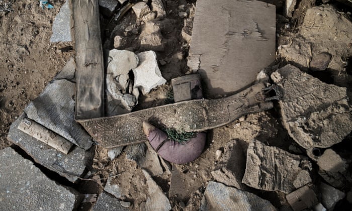 Framed by the distant mountains, the houses still stood tall and slender, but now sheared in half, with their entrails spilling on to piles of earth and heaps of smashed furniture, revealing the long-concealed lives of their inhabitants. A half-hanging arch, timber rafters, wooden frames, a TV set, a Yemeni ceremonial dagger. A child’s seashell necklace.
