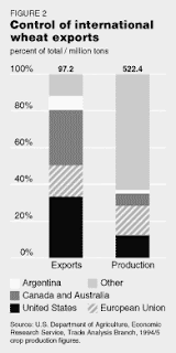 http://2.bp.blogspot.com/-HIASauqnSvU/TkY6aJBoLsI/AAAAAAAAAD4/Tc838r1oGjE/s320/Freem02.gifWhile it is common for countries producing bountiful and nutritious food to become active in the export market, the four focus regions of the cartel were given unbridled priority as world distributors, effectively instilling forced dependency in the restructuring Third World, which fell into the trap of accepting adjustment loans from the very foreign forces which plundered them in colonization; the countries outside the four export regions could either import from the global market, or starve. War was waged against the independent farm economies of the four export regions, sparring nothing outside of corporate central control. In 1976, Russia was sold 12.4 million tons of grain produced in North America by Cargill and Continental, creating a grain shortage in America and Canada at time. Just because the food is grown in the four export regions, does not entitle those countries to guaranteed food security, or mean the ruling governments of those countries have any authority over the destination or prices of the products, because they are harvested and distributed by totally private entities who make their decisions based on profit, not merit or moral supremacy. In studies conducted by the Trade Analysis Branch of the US Department of Agriculture in 1994, the export regions account for eighty eight percent of the world’s wheat exports, when it comprised only thirty nine percent of the world’s wheat production of 522.4 million tons in ’94 – ’95; although these regions came nowhere close to producing the largest quantities of product, their preeminence is forced by the food cartel through flooding any semblance of a ‘free market’.