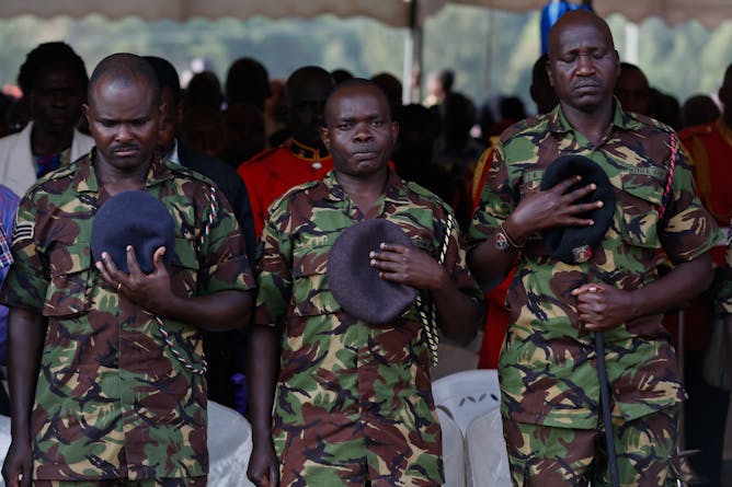 Kenyan soldiers at a prayer service in 2016 to honour compatriots killed in an attack on their Somali base by Al-Shabaab militants.