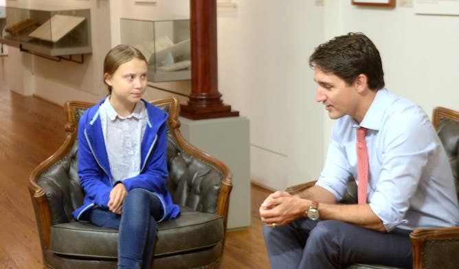 Justin Trudeau speaks to Swedish environmental activist Greta Thunberg in Montreal on Sept. 27, 2019.