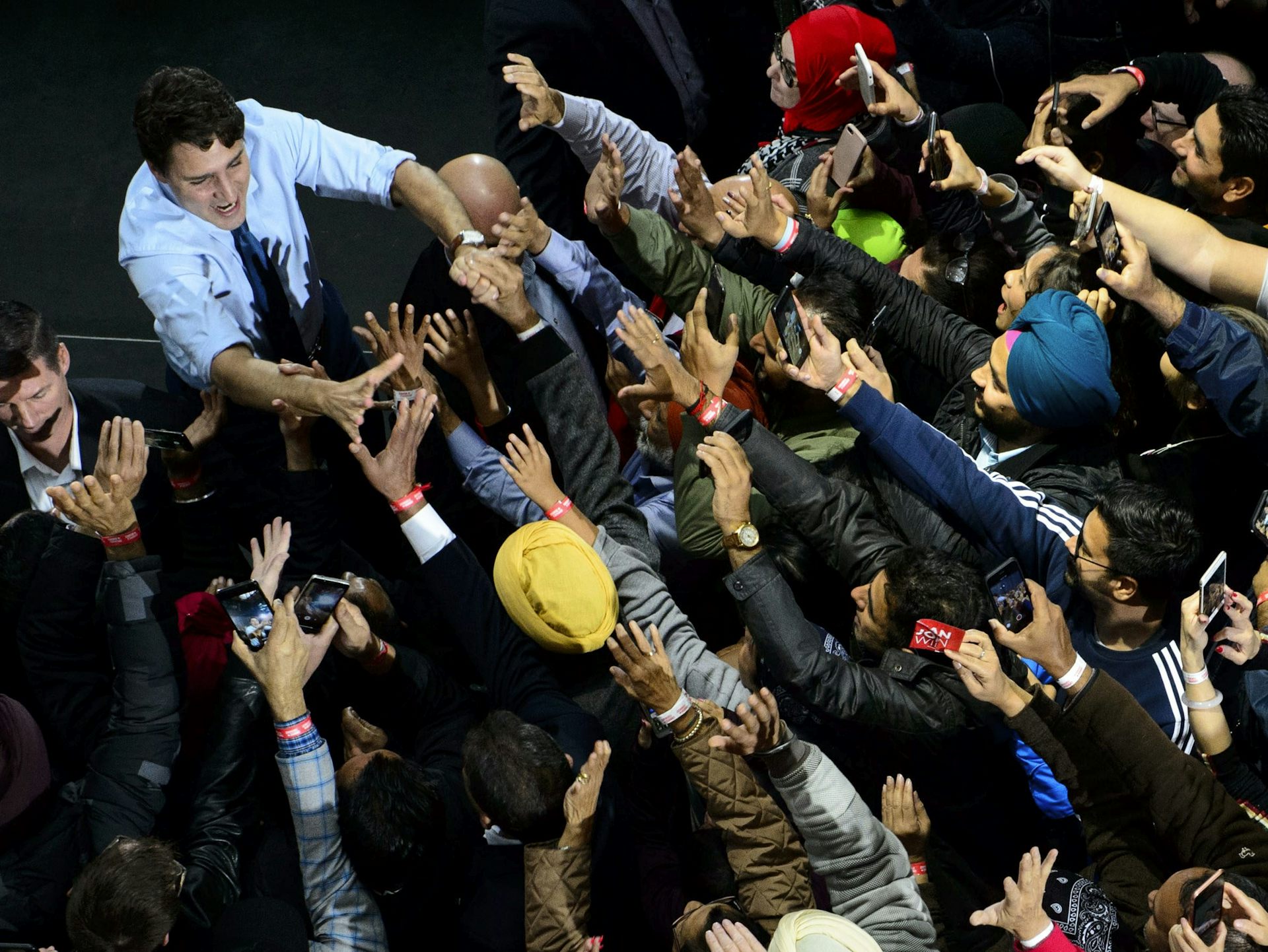 Canadian Prime Minister Justin Trudeau reaches out to supporters at a rally in Vancouver on the eve of the country’s election.