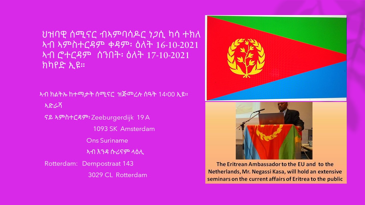 ኣምባሳዶር ነጋሲ ካሳ ኣብ ሕብረት ኣውሮፓን ንግስነት ነደርላንድስ ኣብ ከተማታት ኣምስተርዳምን ሮተርዳምን ሰፊሕ ሰሚናር ከካይድ ኢዩ።
