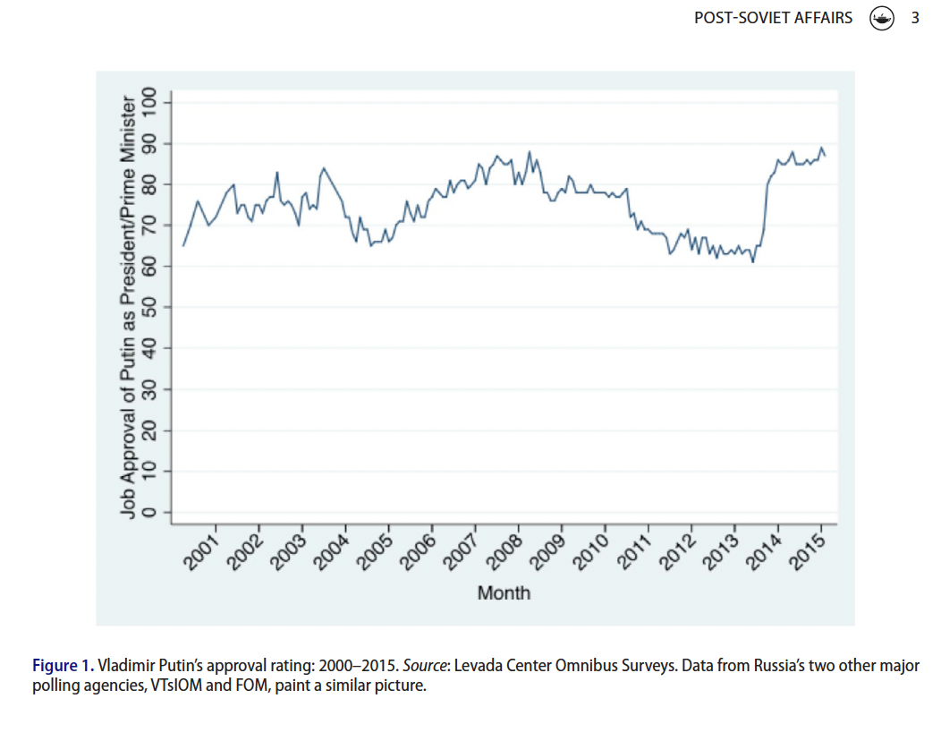 Something else worth pointing out here is that on 10 October 2015, the academic journal Post-Soviet Affairs headlined “Is Putin’s popularity real?”, and showed Vladimir Putin’s measured job-performance ratings, up till that time (and it hasn’t declined since)”: