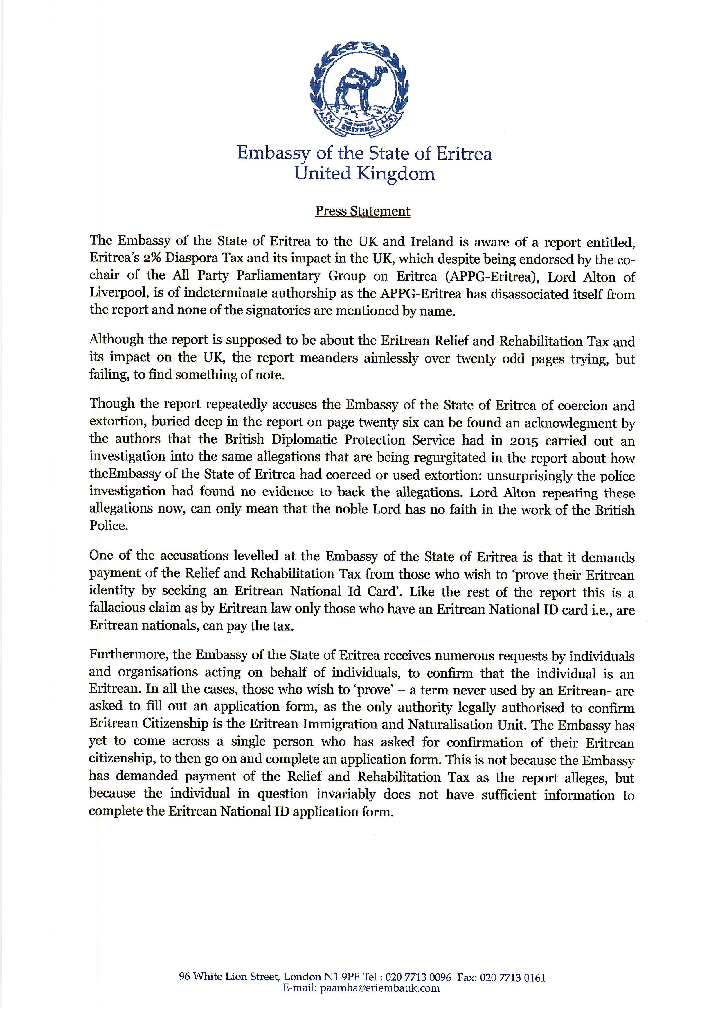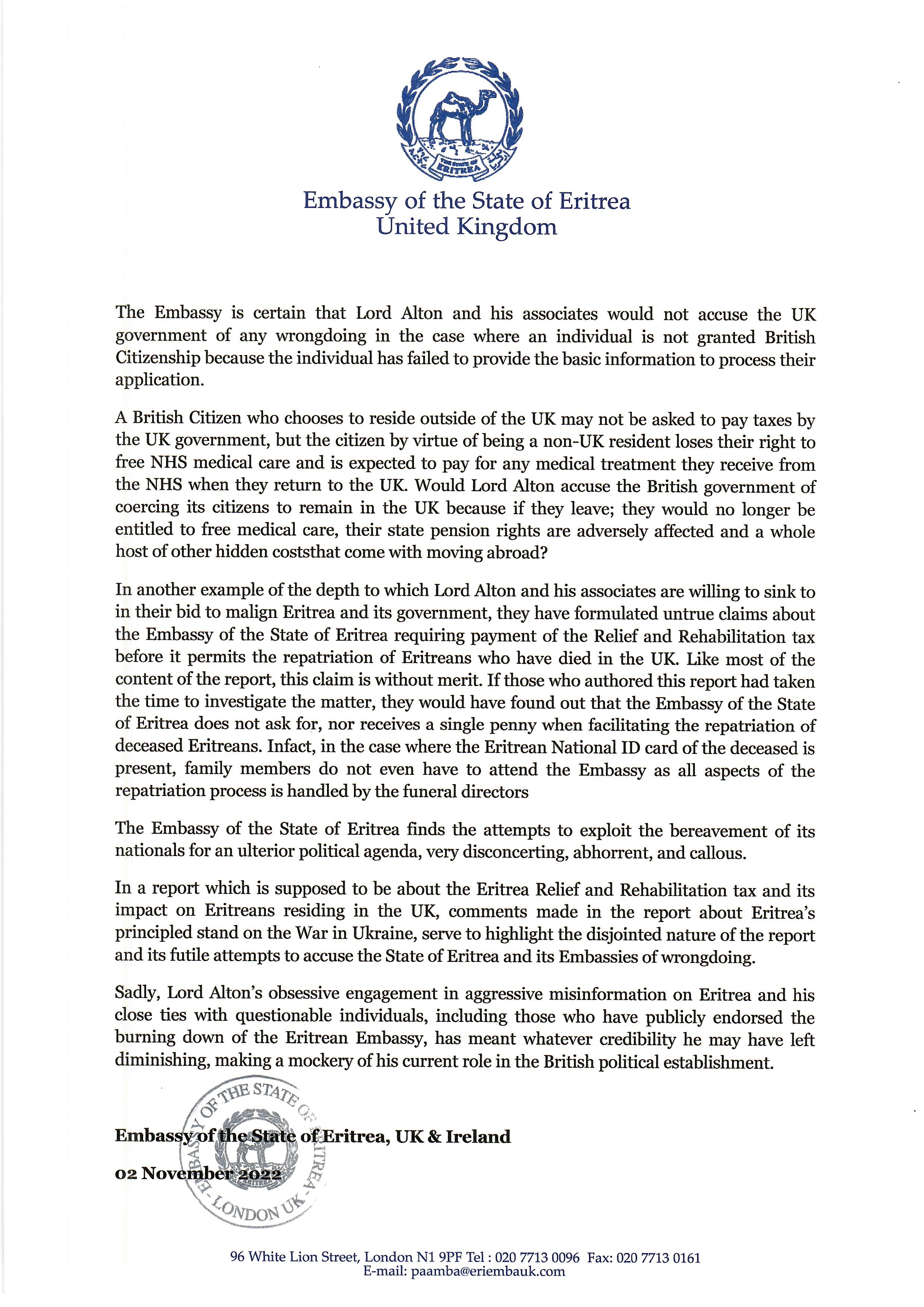 The Embassy is certain that Lord Alton and his associates would not accuse the UK government of any wrongdoing in the case where an individual is not granted British Citizenship because the individual has failed to provide the basic information to process their application.
