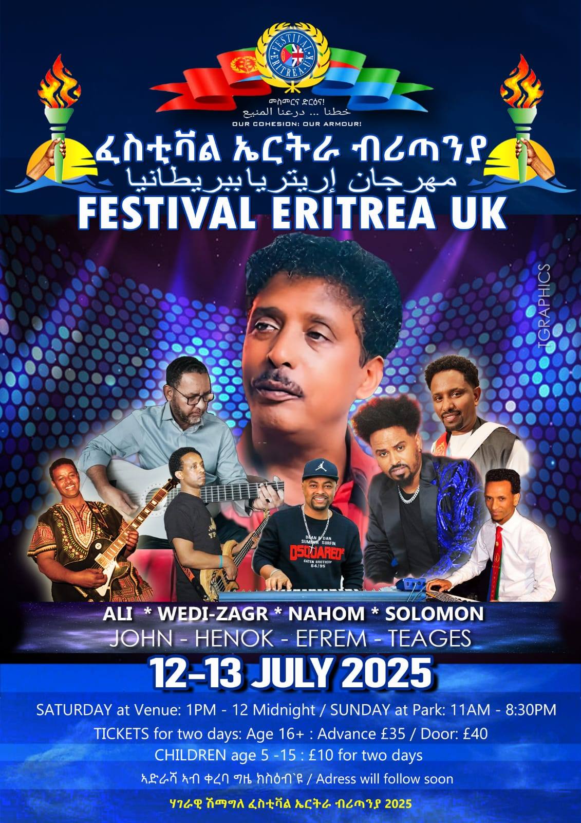The Eritrea Festival 2025 UK will start tomorrow, Saturday, 12th-13th of July, with colourful performances. This year is a celebration of Eritrean values and culture, featuring different spectacular shows. The Festival will take place with a great lineup of artists. It is this ability to view all parts of the musical spectrum through the eyes of so many different performers, young and old, that truly gives the festival its Eritrean prestige.