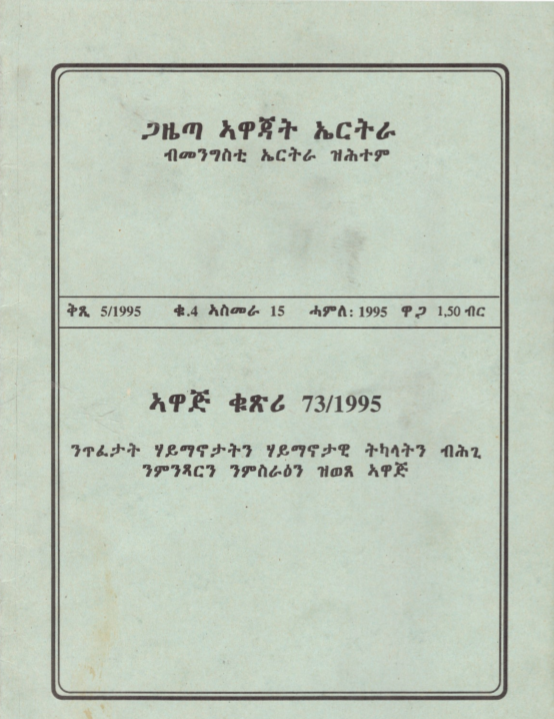(ካብ ጋዜጣ ኣዋጅ ኤርትራ) ኣገዳሲ እዋናዊ ዛዕባ ንኣፍልጦ ህዝቢ - ካብ ጋዜጣ ኣዋጅ ኤርትራ - ኣዋጅ 73/1995 ብዛዕባ ሃይማኖታውያን ትካላት