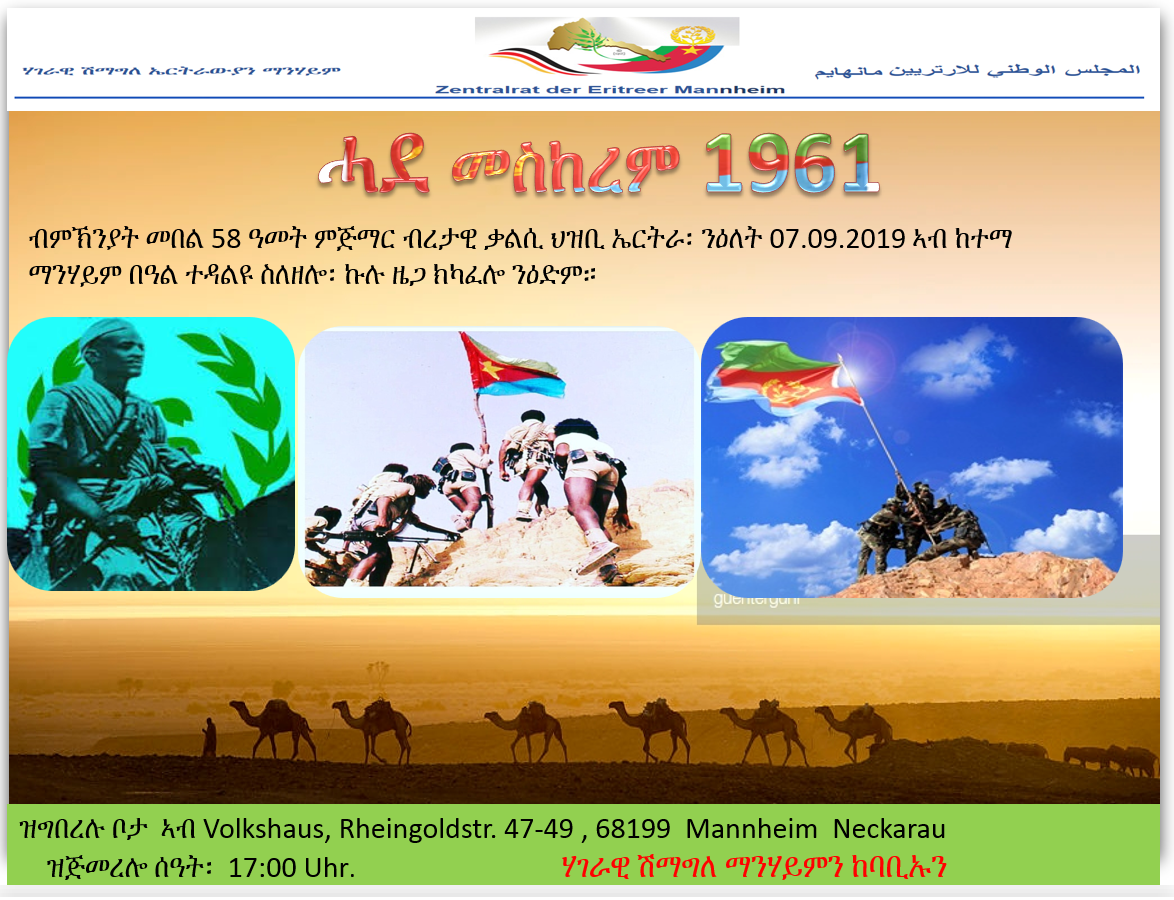 ጽምብል ብዓል ሓደ መስከረም ኣብ ከተማ ማንሃይም - ሃገራዊ ሽማግለ ኤርትራውያን ከተማ ማንሃይም ንኹሉ ኤርትራዊ ዜጋን ኣዕሩኽ ኤርትራን ብኽብሪ ትዕድም