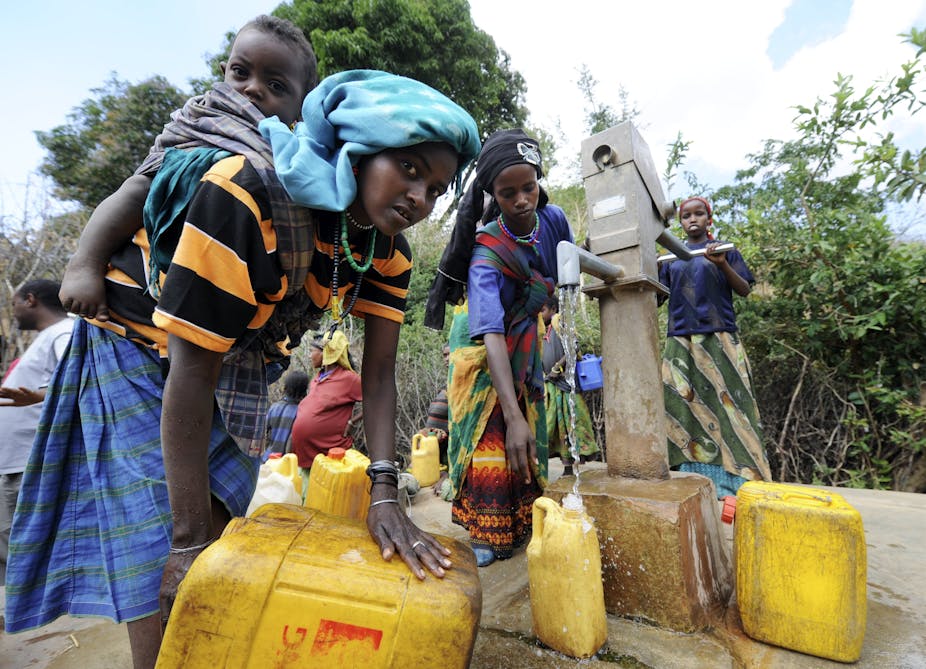 Women fetching water from a borehole drilled by an aid foundation in Babile, Ethiopia.