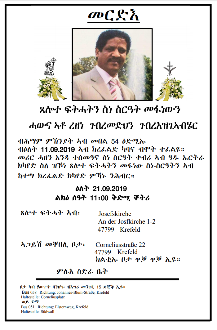 ጸሎተ-ፍትሓትን ስነ-ስርዓት መፋነውን - ሓውና ኣቶ ረዘነ ገብረመድህን ገብረእዝጊኣብሄር - ኣብ ከተማ ክረፈልድ (ጀርመን) ንዕለት 21-09-2019