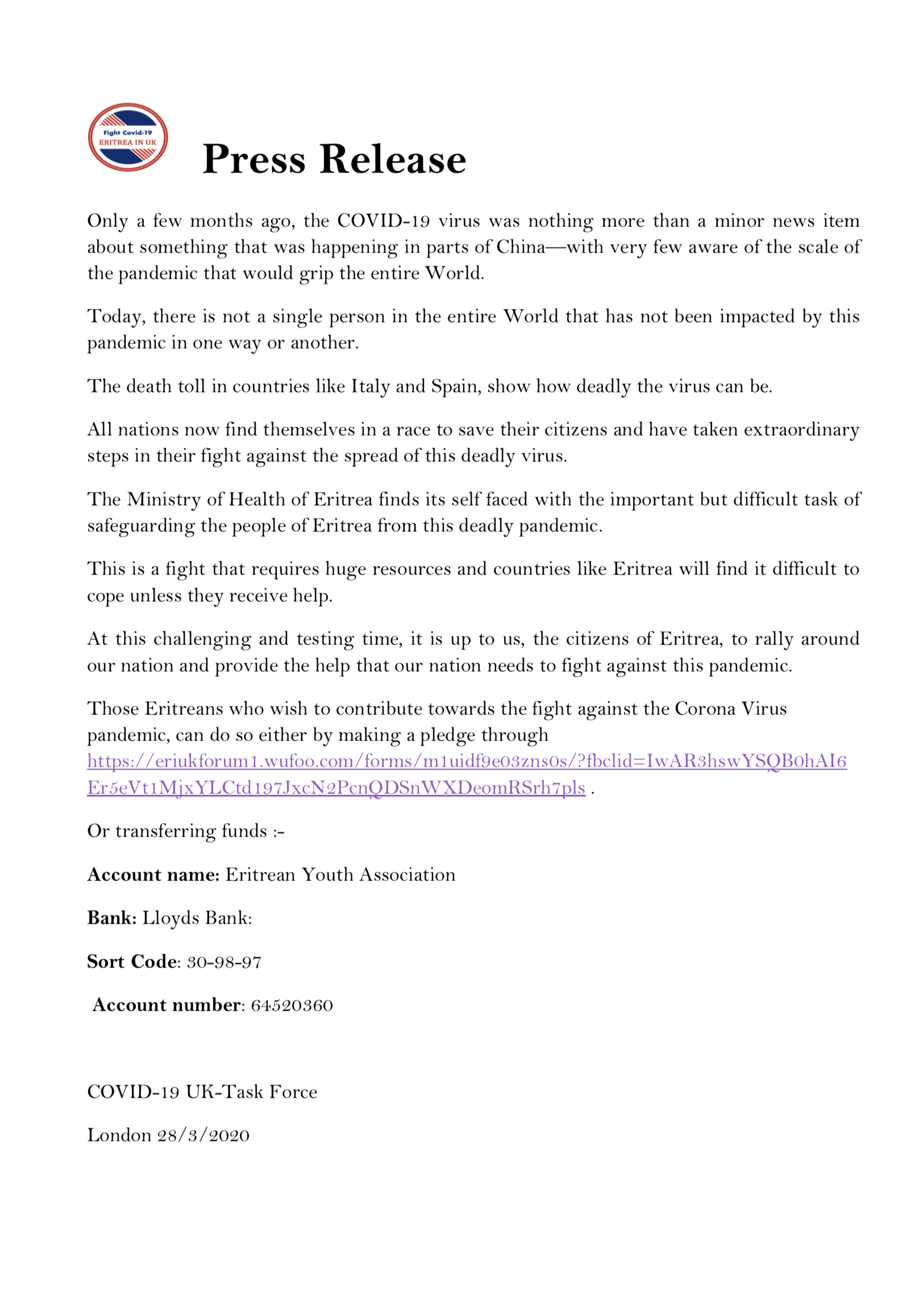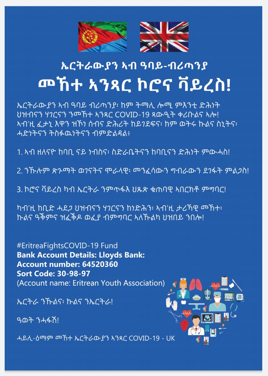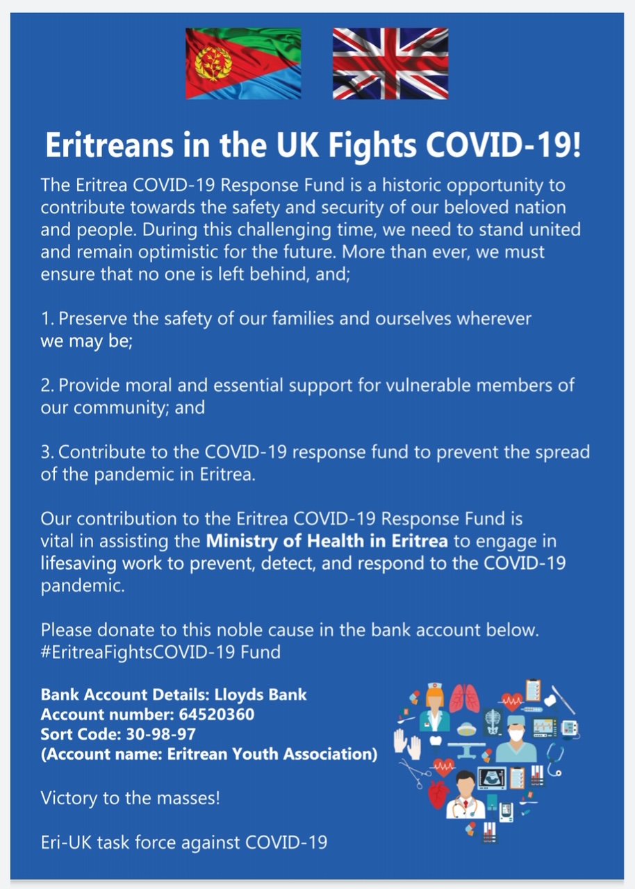 Those Eritreans who wish to contribute towards the fight against the Corona Virus pandemic, can do so either by making a pledge through Contribution for Eritrea COVID-19 Fund - UK .