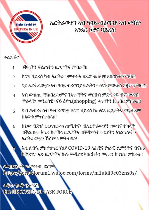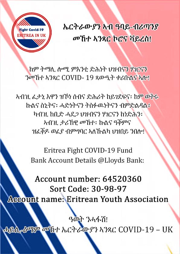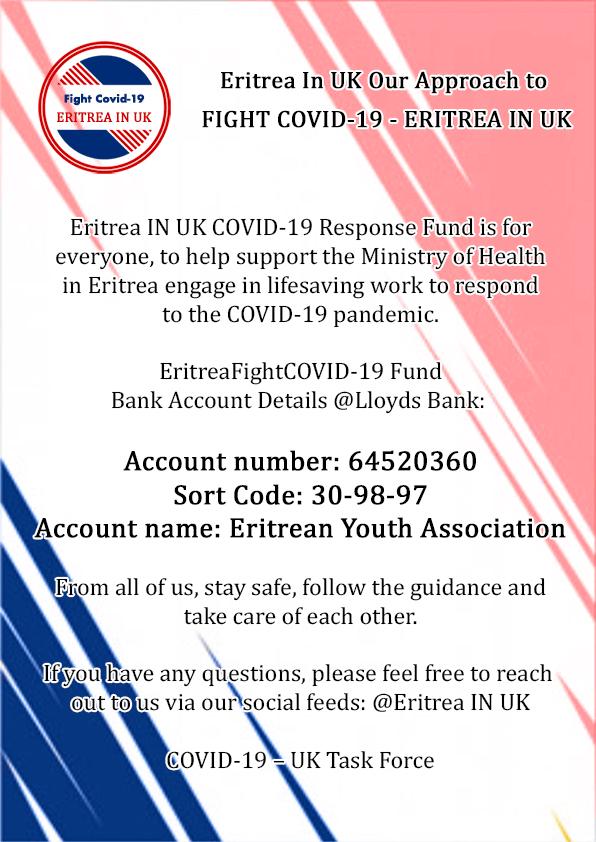against the Corona Virus pandemic, can do so either by making a pledge through Contribution for Eritrea COVID-19 Fund - UK
