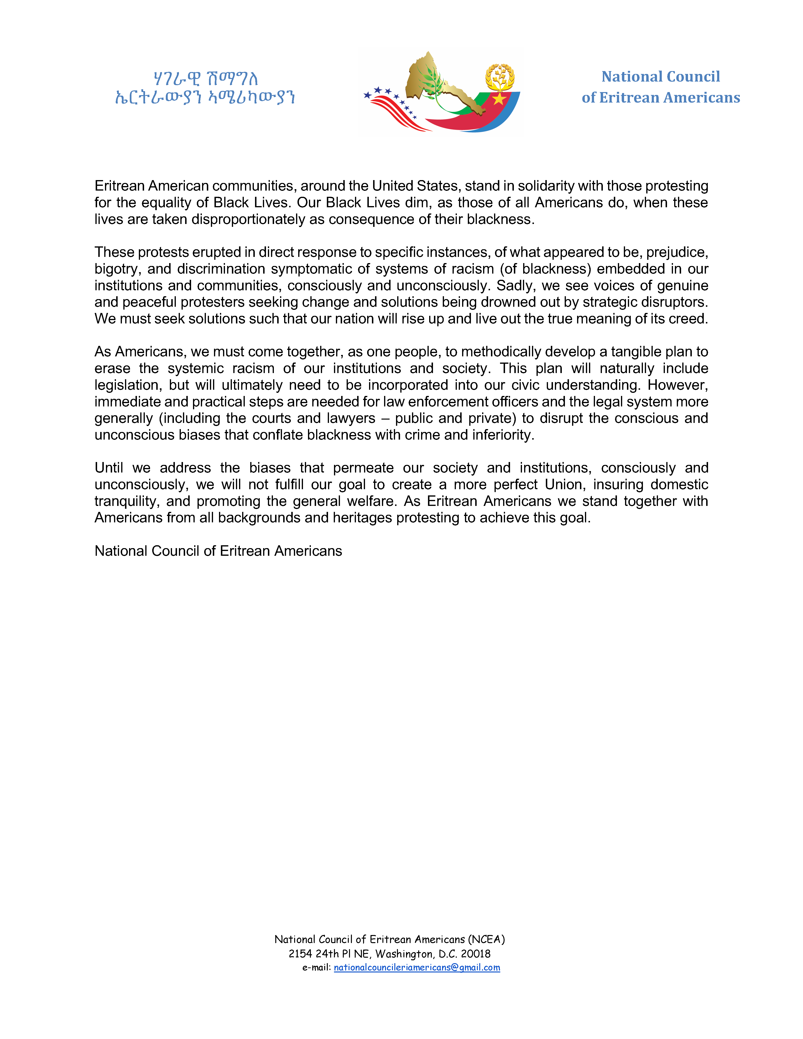 Eritrean American communities, around the United States, stand in solidarity with those protesting for the equality of Black Lives. Our Black Lives dim, as those of all Americans do, when these lives are taken disproportionately as consequence of their blackness.