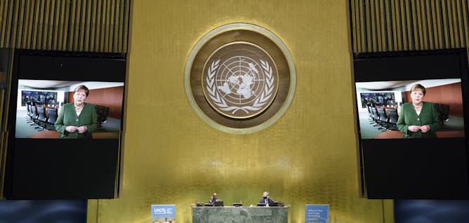 Sorry I can’t be there: German Chancellor Angela Merkel addresses the UN general assembly virtually.