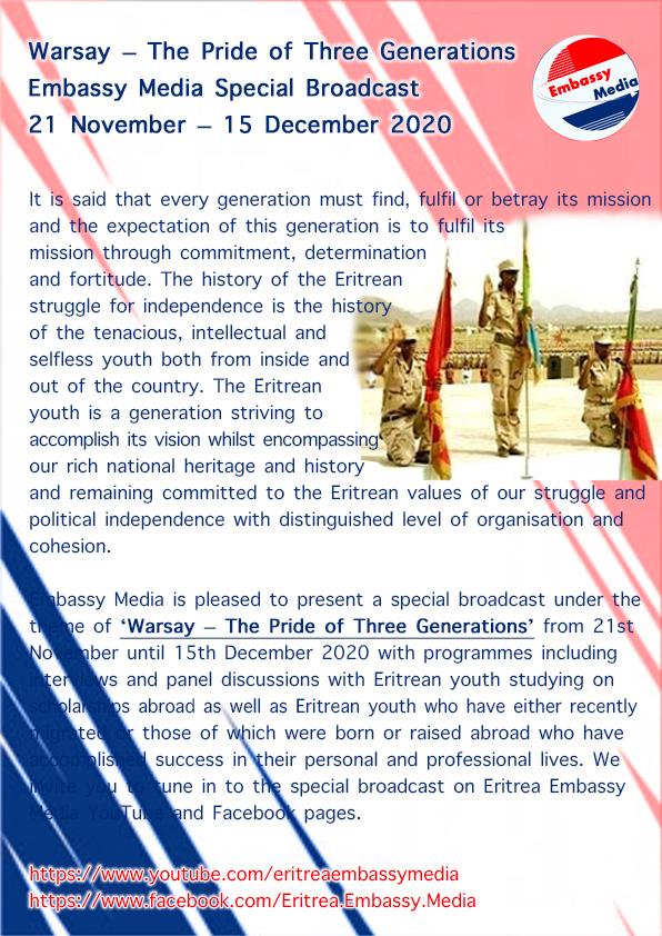 Embassy Media is pleased to present a special broadcast under the theme of ‘Warsay – The Pride of Three Generations’ from 21st November until 15th December 2020 with programmes including interviews and panel discussions with Eritrean youth studying on scholarships abroad as well as Eritrean youth who have either recently migrated or those of which were born or raised abroad who have accomplished success in their personal and professional lives. We invite you to tune in to the special broadcast on Eritrea Embassy Media YouTube and Facebook pages.