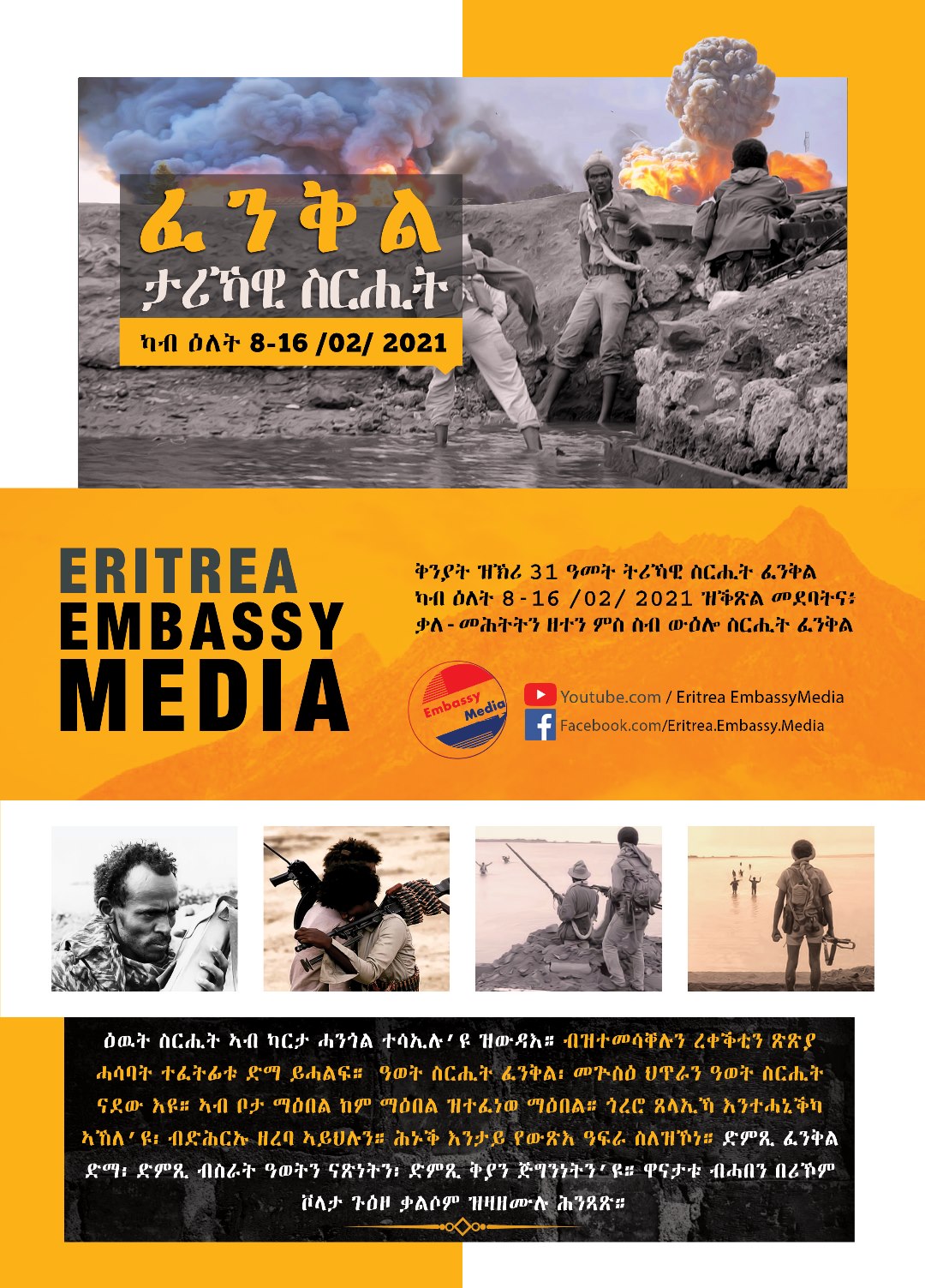 Embassy Media is pleased to present a special broadcast under the theme of ‘FENKIL@31' with film documentaries, interviews, panel discussions with former veteran fighters, members of the EPLF command forces, and social media activist. We invite you to tune in to the special broadcast on Eritrea Embassy Media YouTube and Facebook Channels:-