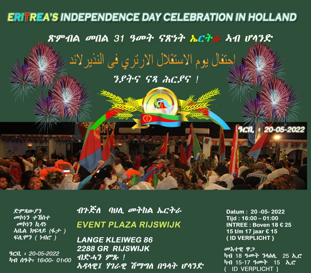 መበል 31 መዓልቲ ናጽንት ኤርትራ ኣብ ዕለት 20 ግንቦት 2022 ብክብ ዝበለ ድምቐት ኣብ Rijswijk Holland ክጽምበል እዩ።