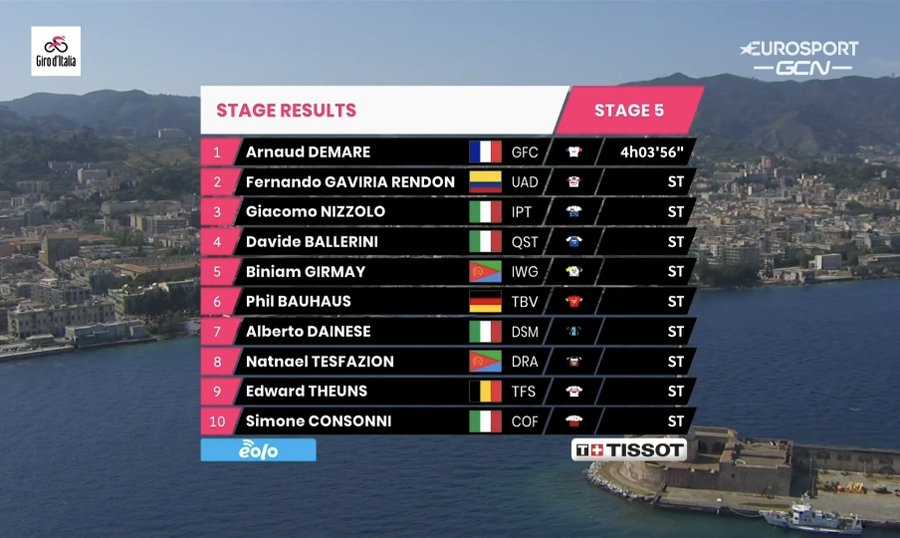 The Frenchman, who won four stages at the 2020 Giro and one in 2019, opened his sprint with 200 metres to go and comfortably held off Davide Ballerini on his right, who was sprinting as Cavendish’s replacement as one of only two riders spared from waiting for the Manxman on the climb. Gaviria hijacked Giacomo Nizzolo’s (Israel-Premier Tech) lead-out but couldn’t get on terms with Démare and bounced his bike in frustration, while Nizzolo himself eased through for the final podium spot ahead of Ballerini.