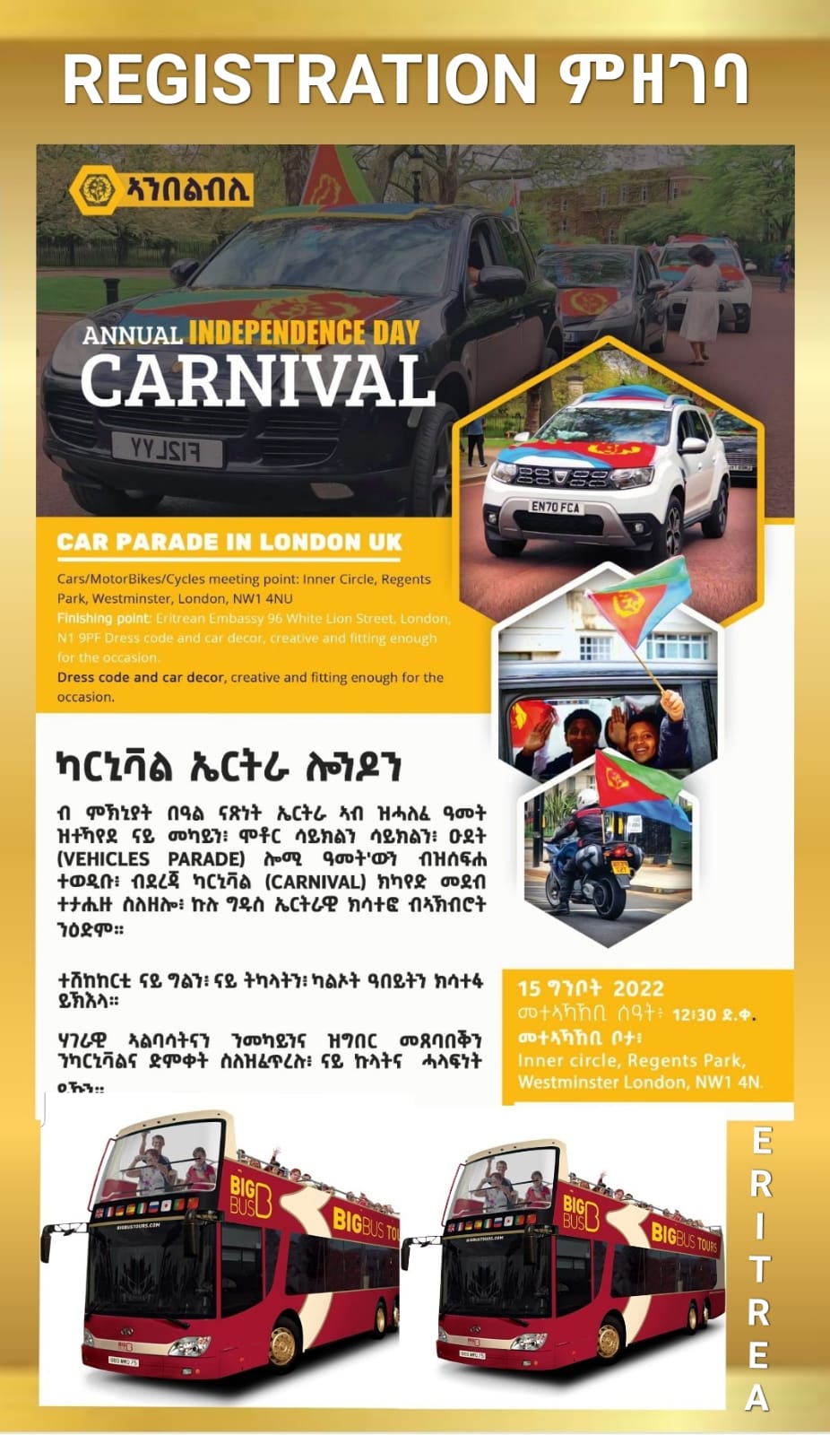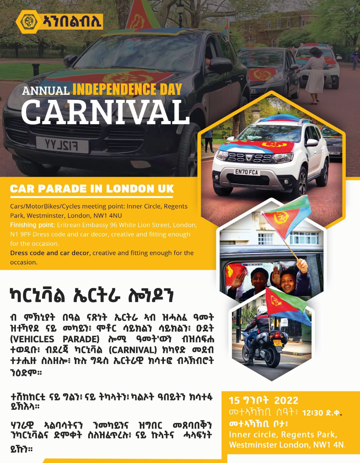 |  | EmbassyMedia - ብ ምኽኒያት በዓል ናጽነት ኤርትራ - ኣንበልብሊ ባንዴራይ ካርኒቫል ኤርትራ ኣብ ሎንዶን! |