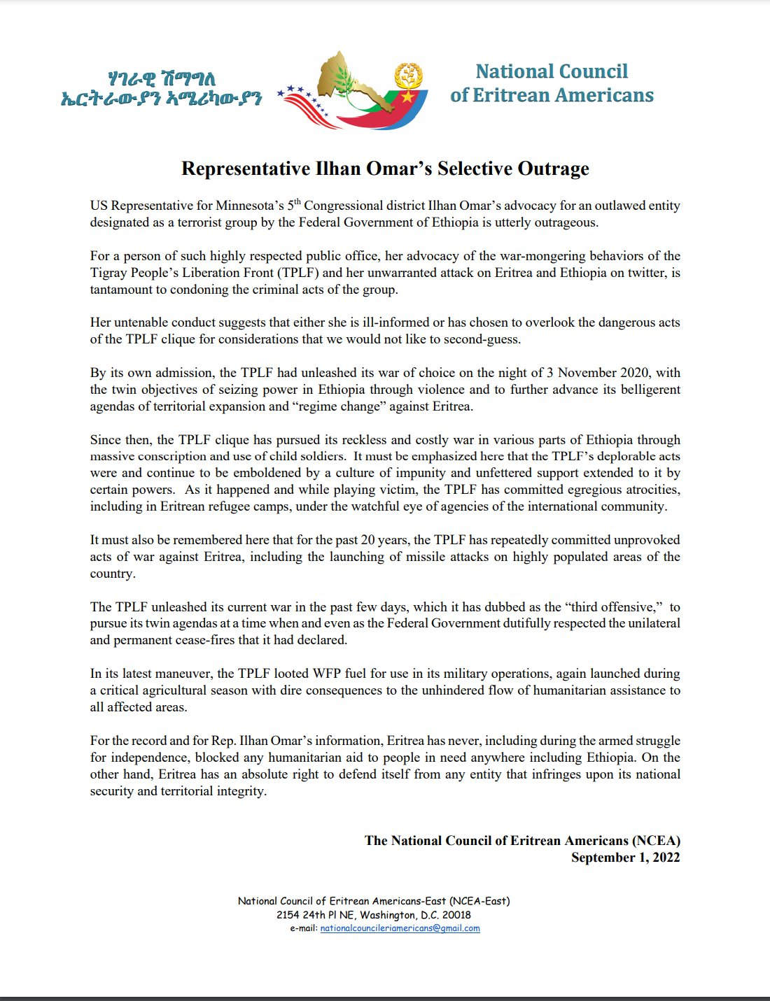 (NCEA) A statement from The National Council of Eritrean Americans: Representative Ilhan Omar's Selective Outrage
