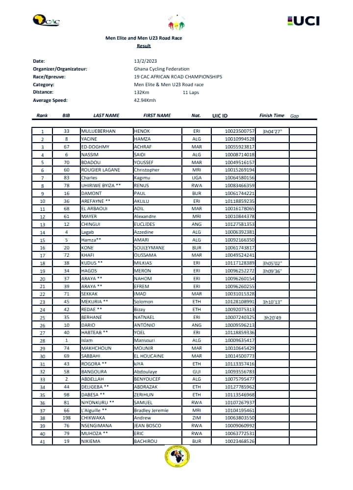 Eritrea's Henok Mulubrhan defended his men's road race title at the African Cycling Confederation (CAC) African Road Championships in Ghana's capital Accra, while Nigeria's Ese Upkeseraye won the women's road race.
