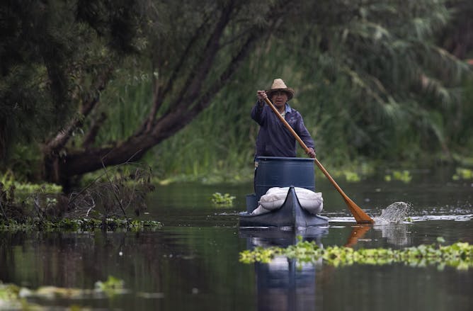 A farmer paddles to his fields on an artificial island among canals, part of an ancient Aztec system known as chinampas, in 2021.