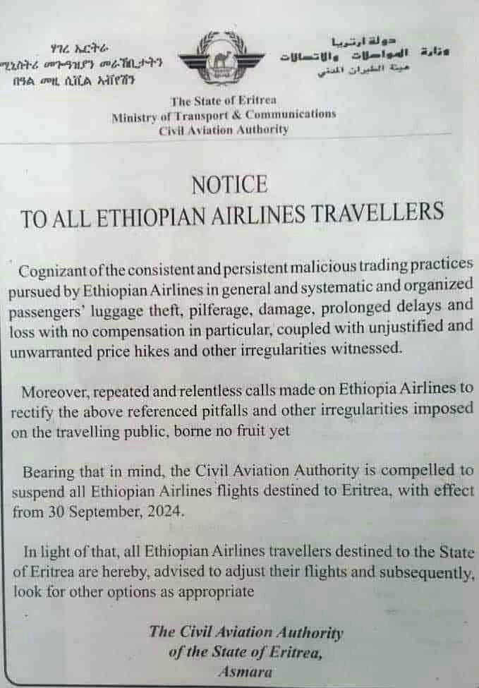 In a message issued to Ethiopian Airlines passengers, the Eritrean government urged those planning to fly with the airline after September 30 to make alternative arrangements.