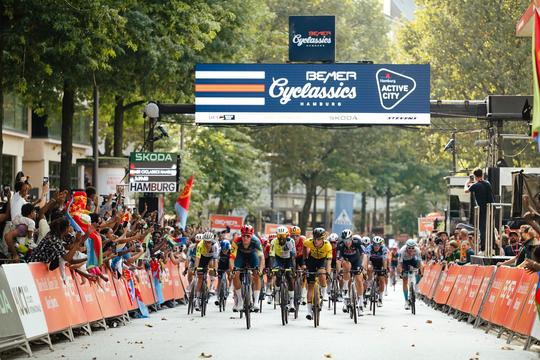Olav Kooij (Visma-Lease a Bike) stormed to victory in the BEMER Cyclassics one-day race, timing his sprint perfectly to the line ahead of a charging Jonathan Milan (Lidl-Trek) and Biniam Girmay (Intermarché-Wanty) in Hamburg.