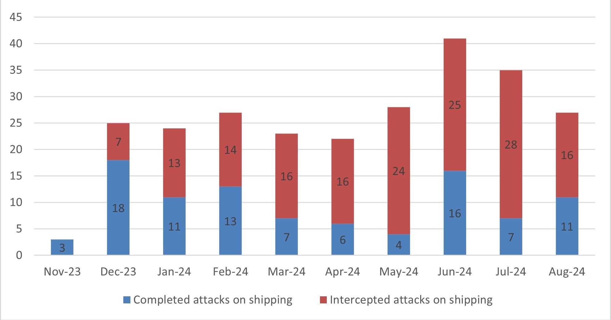 [k] Operation Prosperity Guardian (OPG) also reports the interception of incoming attacks that are not counted by JMIC incident reporting. JMIC incidents are reported by shippers, who are not themselves witness to interceptions far away from their vessels. To give an example of the OPG intercept data, on September 24, 2024, a tweet released by @CENTCOM noted that “U.S. Central Command (USCENTCOM) forces successfully destroyed one Iranian-backed Houthi uncrewed aerial vehicle over the Red Sea.” See U.S. Central Command, “Sept 24 U.S. Central Command Update: In the past 24 hours, U.S. Central Command (USCENTCOM) forces successfully destroyed …,” X, September 24, 2024.