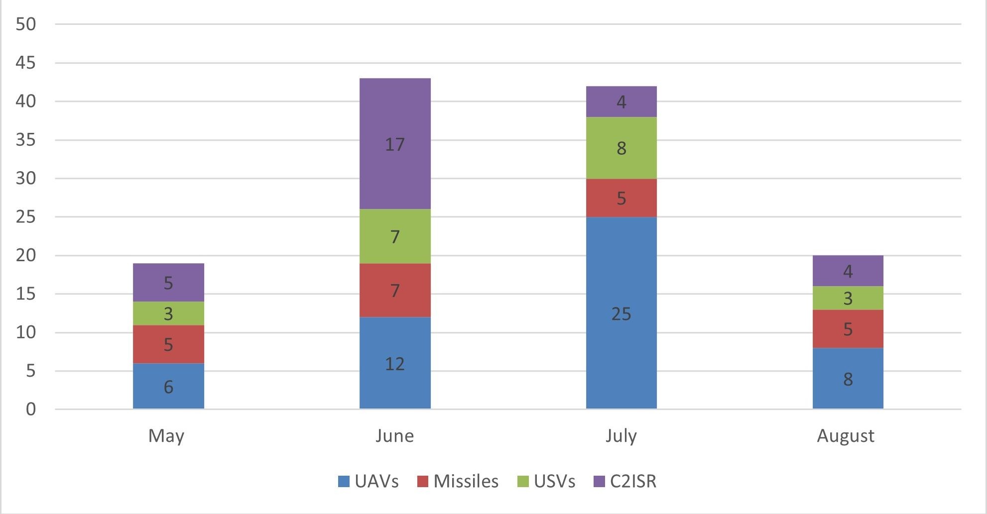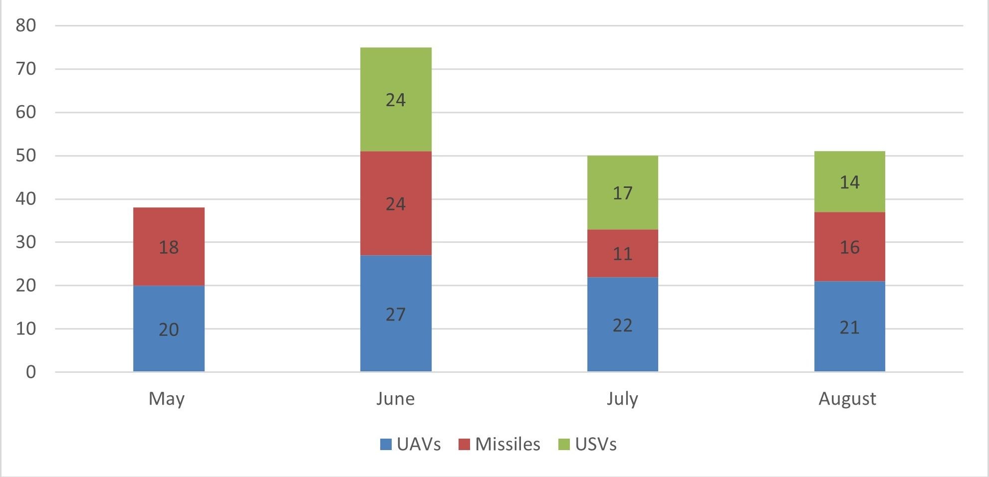 The prior April 2024 CTC Sentinel study on the Houthi war effort in October 2023 to April 2024 provided an in-depth review of Houthi anti-shipping weapons—the Mohit and Asef ASBMs, the Al-Mandab-2 anti-ship cruise missile, a variety of fixed and delta-wing explosive-carrying UAVs, plus explosive drone boats (unmanned surface vehicles, or USVs).102 This study will not repeat the lengthy profiles of these weapons and how they have been employed by the Houthis, only insofar as their mode of employment has changed significantly since then. The April 2024 study anticipated a gradual depletion of higher-end systems like ASBMs, but this did not manifest.103 The following chart (Figure 2) shows numbers of projectiles detected by the author as having been employed by the Houthis in anti-shipping attacks since the end of April 2024.104 Like all attack data, this is an imprecise art and is only meant to be indicative of the number of missiles,am UAVs, and USVs reported by coalition forces as intercepted during attacks, or reported by shippers impacting near or on vessels in proven attacks. Trends include the rise in attacks by explosive drone boats (USVs) in the summer; a more even spread of attack types; and a consistent drumbeat of UAV attacks, probably reflecting the relative ease of producing such systems inside Yemen.105