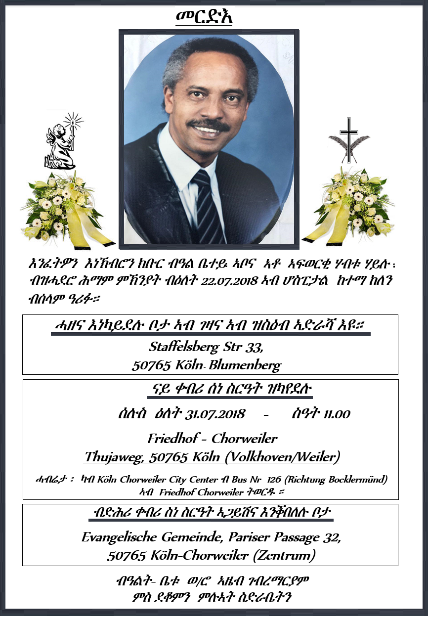 መርድእ - እንፈትዎን እነኽብሮን ክቡር - ኣቶ ኣፍወርቂ ሃብቱ ሃይሉ - ብዕለት 22.07.2018 ኣብ ከተማ ከለን - ብሰላም ዓሪፉ።