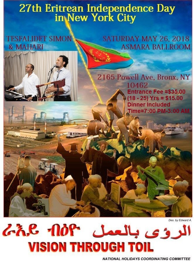 Re- 27th Eritrean Independence Day In New York City: Saturday May 26, 2018 Come join us to celebrate our hard earned Independence at Asmara BallRoom 2165 Powell Ave Bronx. NY