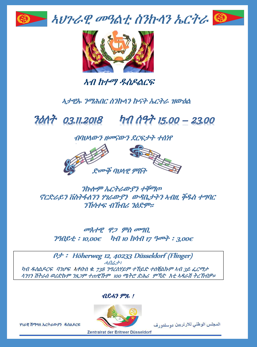 ኣህጉራዊ መዓልቲ ስንኩላን ኤርትራ ኣብ ከተማ ዱስዶልርፍ ንዕለት 03.11.2018 ካብ ሰዓት 15.00 – 23.00
