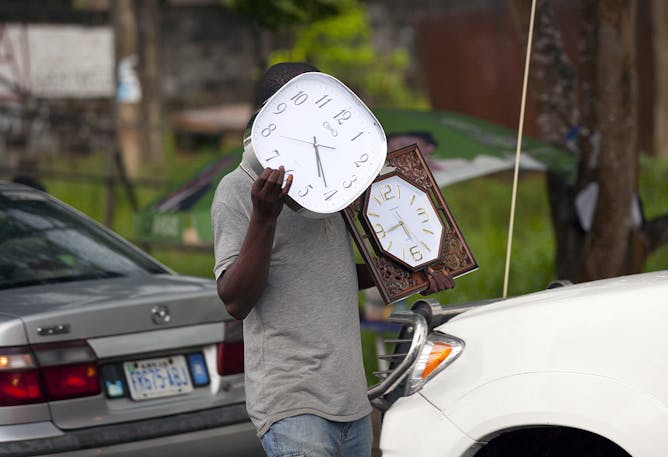 A hawker sells clocks on a roadside in Nigeria’s oil rich Bayelsa state.