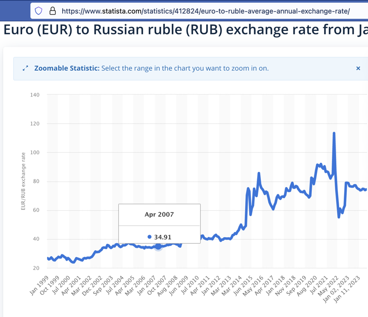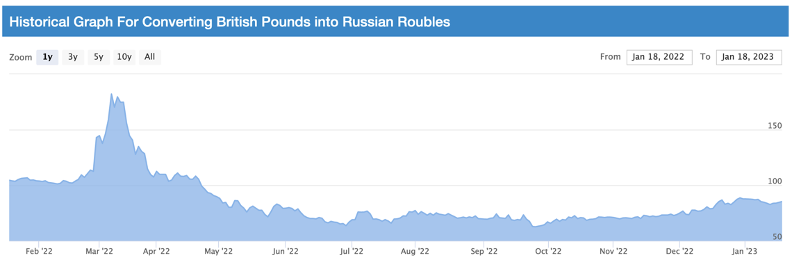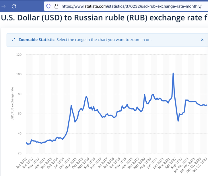 In short: the major damage that The West (the U.S. and its allies) has done to Russia’s economy was when Obama’s coup in February 2014 grabbed Ukraine for The West and turned that nation on Russia’s border rabidly anti-Russian. However, Russia, since at least January of 2022, has economically gained, not lost, in comparison to America, Europe, and Britain. Thus far, Russia’s economy, as indicated in the exchange-rates, has performed, between January and now, better than America’s and far better than Europe’s and England’s has. Compared to what the ruble was worth in January 2022, just before Russia invaded Ukraine, the Ruble has increased in exchange-value against the dollar, and against the euro, and against the pound.