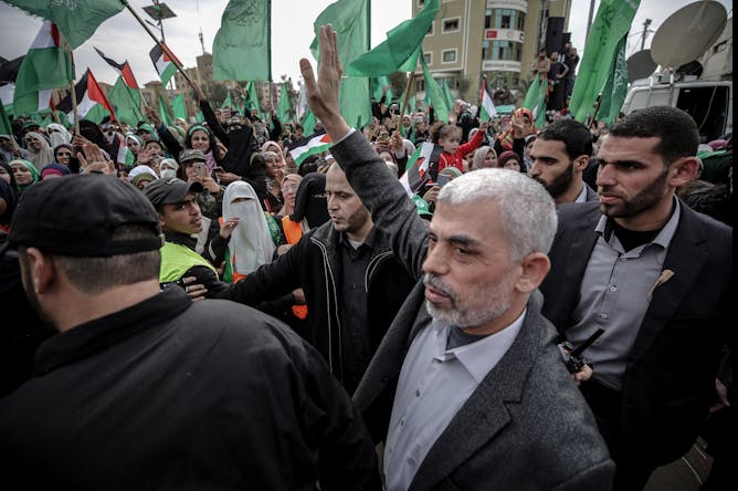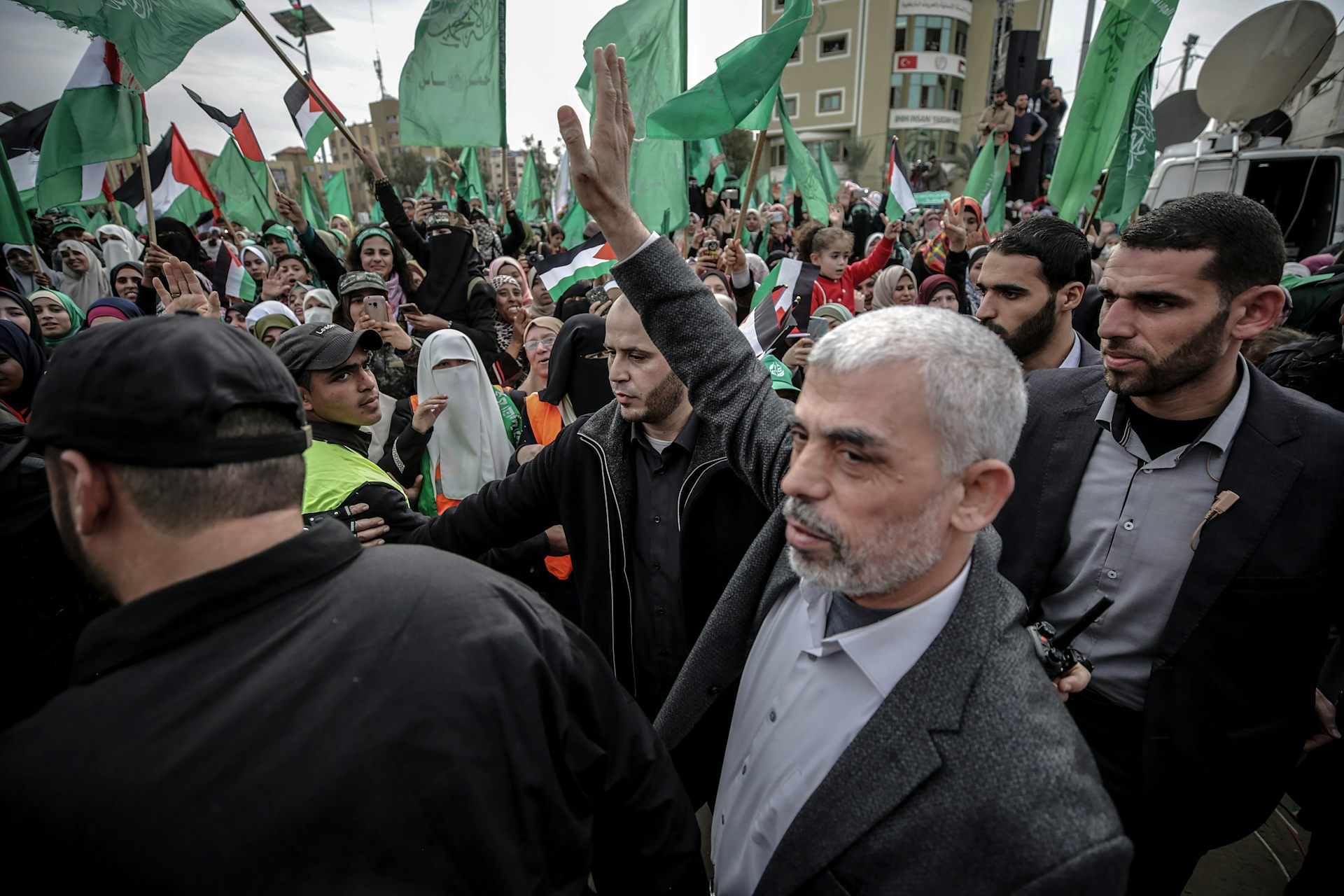 Yahya Sinwar (centre) waving to supporters during a Hamas rally in Gaza City in 2018.