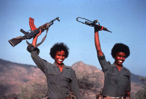 Eritrean Peoples Liberation Front fighters raise their Kalashnikovs in