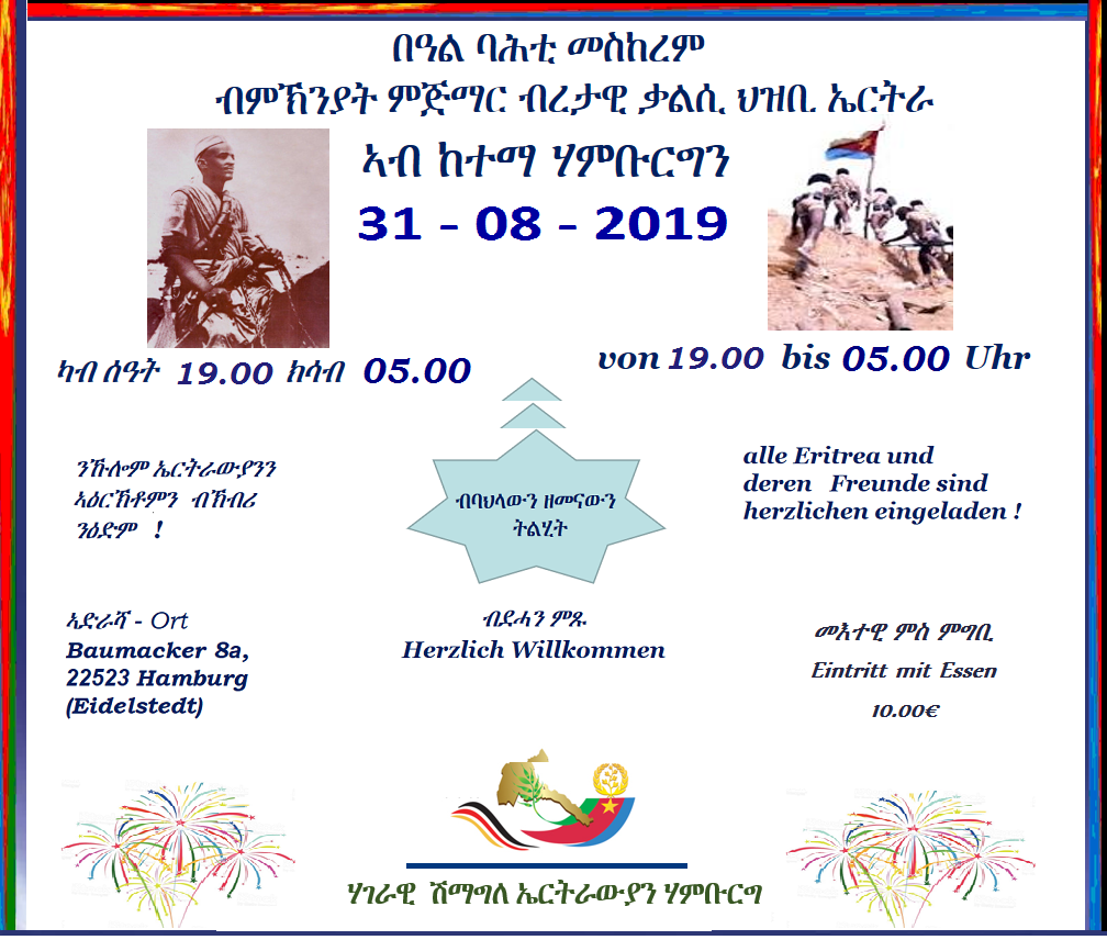 ጽምብል ብዓል ሓደ መስከረም ኣብ ከተማ ሃምቡርግ *** /////*** ሃገራዊ ሽማግለ ከተማ ሃምቡርግ ንኹሉ ኤርትራዊ ዜጋን ኣዕሩኽ ኤርትራን ብኽብሪ ትዕድም
