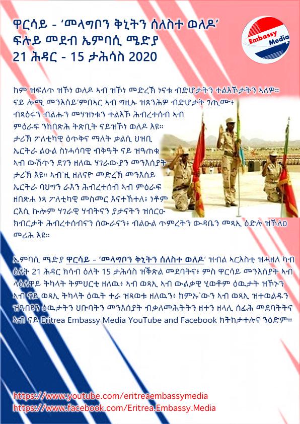 ከም ዝፍለጥ ዝኾነ ወለዶ ኣብ ዝኾነ መድረኽ ነናቱ ብድሆታትን ተልእኾታትን ኣለዎ። ናይ ሎሚ መንእሰይ’ምበኣር ኣብ ግዚኡ ዝጸንሕዎ ብድሆታት ገጢሙ፥ ብጻዕሩን ብልሑን መሃዝነቱን ተልእኾ ሕብረተሰብ ኣብ ምዕራፍ ንከበጽሕ ትጽቢት ናይዝኾነ ወለዶ እዩ። ታሪኽ ፖለቲካዊ ዕጥቅና ማለት ቃልሲ ህዝቢ ኤርትራ ልዑል ስነሓሳባዊ ብቅዓት ናይ ዝዓጠቁ ኣብ ውሽጥን ደገን ዘለዉ ሃገራውያን መንእሰያት ታሪኽ እዩ። ኣብ`ዚ ዘለናዮ መድረኽ መንእሰይ ኤርትራ ባህግን ራእን ሕብረተሰብ ኣብ ምዕራፍ ዘበጽሐ ነጻ ፖለቲካዊ መስመር እናተኸተለ፥ ነቶም ርእሲ ኩሎም ሃገራዊ ሃብትናን ያታናትን ዝሰርዑ ክብርታት ሕብረተሰብናን ሰውራናን፥ ብልዑል ጥምረትን ውዳቤን መጻኢ ዕድሉ ዝኾለዐ መሪሕ እዩ።