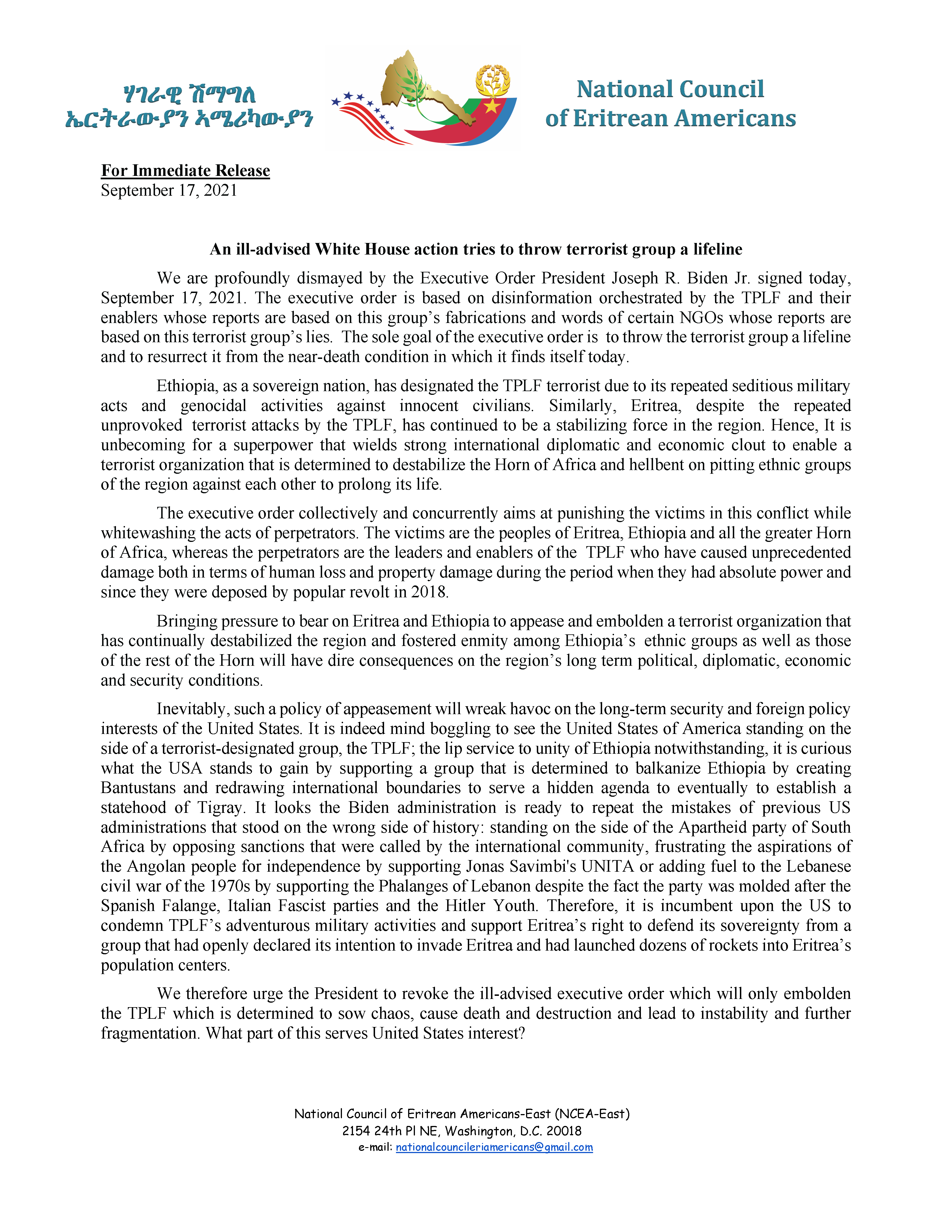 We are profoundly dismayed by the Executive Order President Joseph R. Biden Jr. signed today, September 17, 2021. The executive order is based on disinformation orchestrated by the TPLF and their enablers whose reports are based on this group’s fabrications and words of certain NGOs whose reports are based on this terrorist group’s lies. The sole goal of the executive order is to throw the terrorist group a lifeline and to resurrect it from the near-death condition in which it finds itself today.
