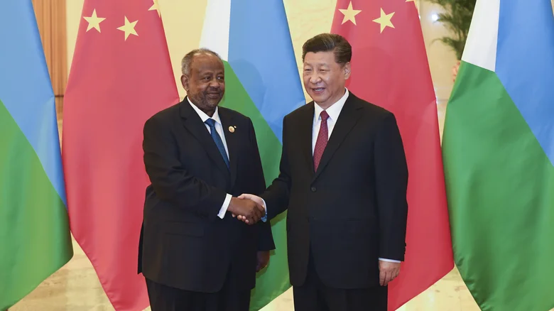 Guelleh shaking hands with Xi Jinping