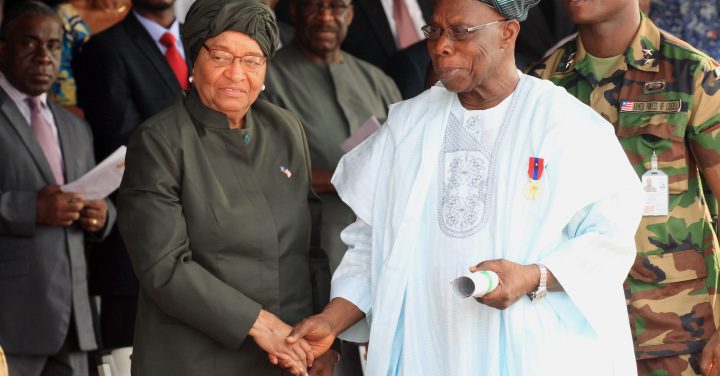 *Then president of Liberia Ellen Johnson Sirleaf (left) welcomes former Nigerian president Olusegun Obasanjo (right) to Monrovia, Liberia, on 11 February 2017. (Photo: EPA / Ahmed Jallanzo)