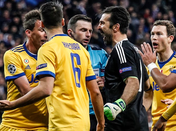 Referee Michael Oliver (in blue) is abused by Juventus goalkeeper Gianluigi Buffon during a 2018 Champions League tie. Afterwards, Oliver and his wife were sent abusive emails and texts, including death threats.