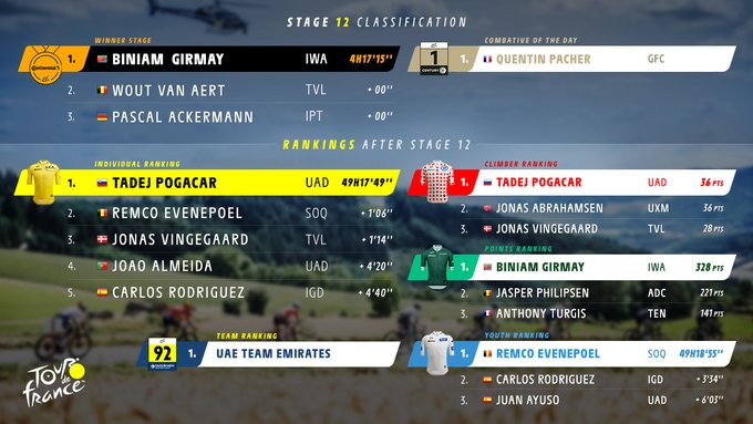 Pogacar's team-mate Joao Almeida is now fourth in the overall standings, with Ineos rider Carlos Rodriguez in fifth.