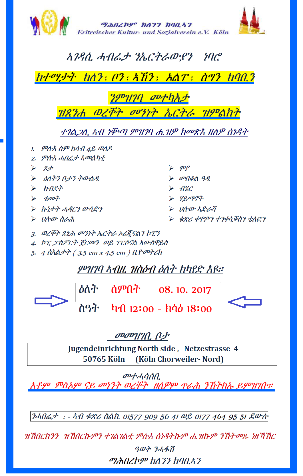 ንሰምበት ዕለት 08. 10. 2017 ምዝገባ መተካእታ ዝጸንሐ ወረቐት መንነት ኤርትራ ዝምልከት ንኤርትራውያን ነባሮ ከተማታት ከለን ፤ ቦን ፤ ኣኸን ፤ ኦልፐ ፤ ሲግን ከባቢን