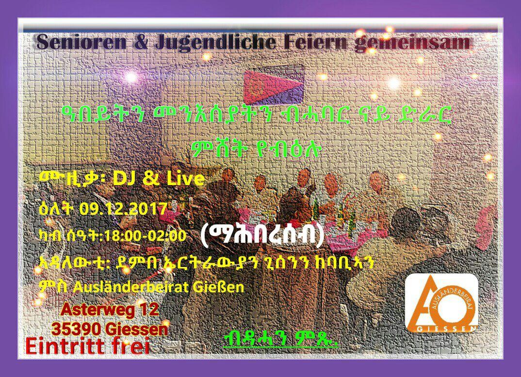 ማሕበርሰብ ከተማ ጊስን (ጀርመን) ንመንእሰያትን ዓበይቲን ብሓባር ናይ ድራርን ባህላዊን ምሸት፡ ብድሙቕ ትልሂት ንዕለት 09. 12. 2017 ብኽብሪ ትዕድም