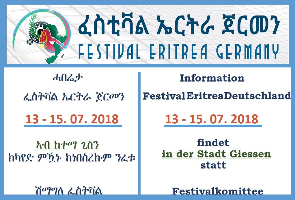 ፈስትቫል ኤርትራ ጀርመን 2018 ንዕለት 13-15.07.2018 ተመዲቡ ከምዘሎ ከነበስረኩም ንፈቱ