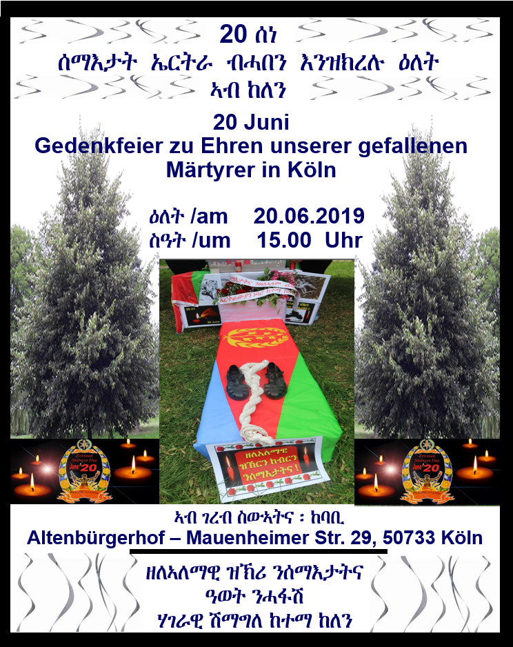 20 ሰነ መዓልቲ ሰማእታት ኤርትራ ንዕለት 20-06-2019 ስዓት 15.00 ኣብ ገረብ ሰማእታት ከለን **** 20 Juni Gedenkfeier zu Ehren unserer gefallenen Maertyrer am 20 Juni 2019 in Köln