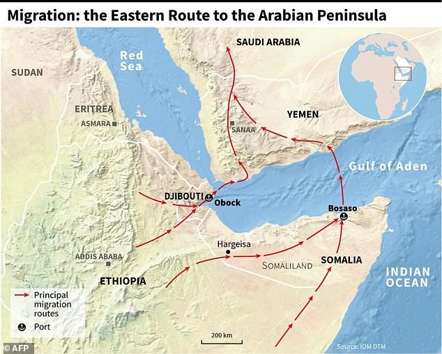 The journey takes migrants -- mainly Ethiopians, but also some Somalis -- from the Horn of Africa across the Gulf of Aden to war-torn Yemen